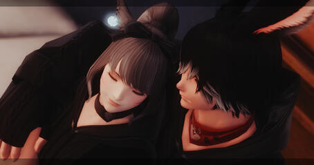 Besides all those fights and her life as Warrior of Light, Rhaya managed it to settle down a bit. She always had a hard time relationshipwise. Starting with her past of running away from her family, that's why it wasn't easy for her to create new bonds. Though she found a circle of people she trusts. Those friends taught her, that you don't have to be connected by blood to be a family. One of them - "best bnuuy boy", how she called him secretly - got a special spot in her heart. Not expecting to getting this close, they started adventuring together some time ago. He gave her a new home and one day both noticed that it's more than friendship.